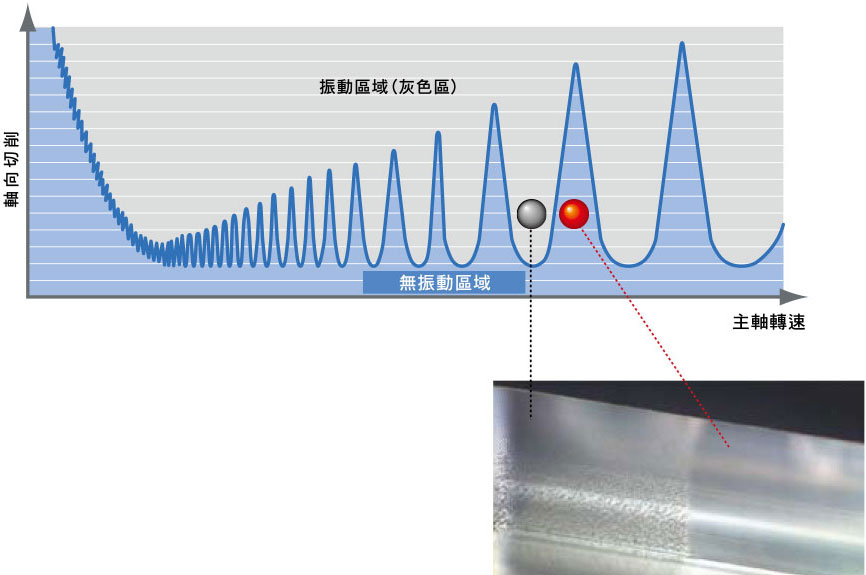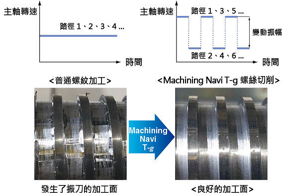 在螺紋加工中發生振刀時,通常的解決方法是犧牲生產效率降低加工條件,或者提高成本使用不易發生振刀的特殊刀具。“Machining Navi T-g螺紋切削”為了抑制振刀導致的周期性振動,每加工1週會提高或降低主軸轉速,以做到最佳控制。通過使用Machining Navi可最大程度控制成本的增加和生產效率的降低。