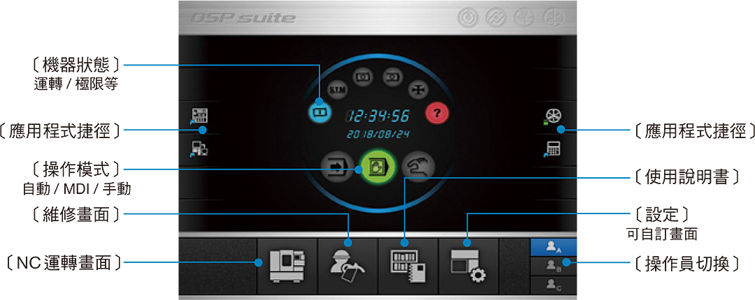 採用適合加工現場的高可靠性觸摸面板。通過觸摸螢幕右側的功能鍵圖標啟動suite應用,畫面上將彈出對應程式。可自定義圖標佈局。通過單觸就可隨時訪問想使用的應用程式。